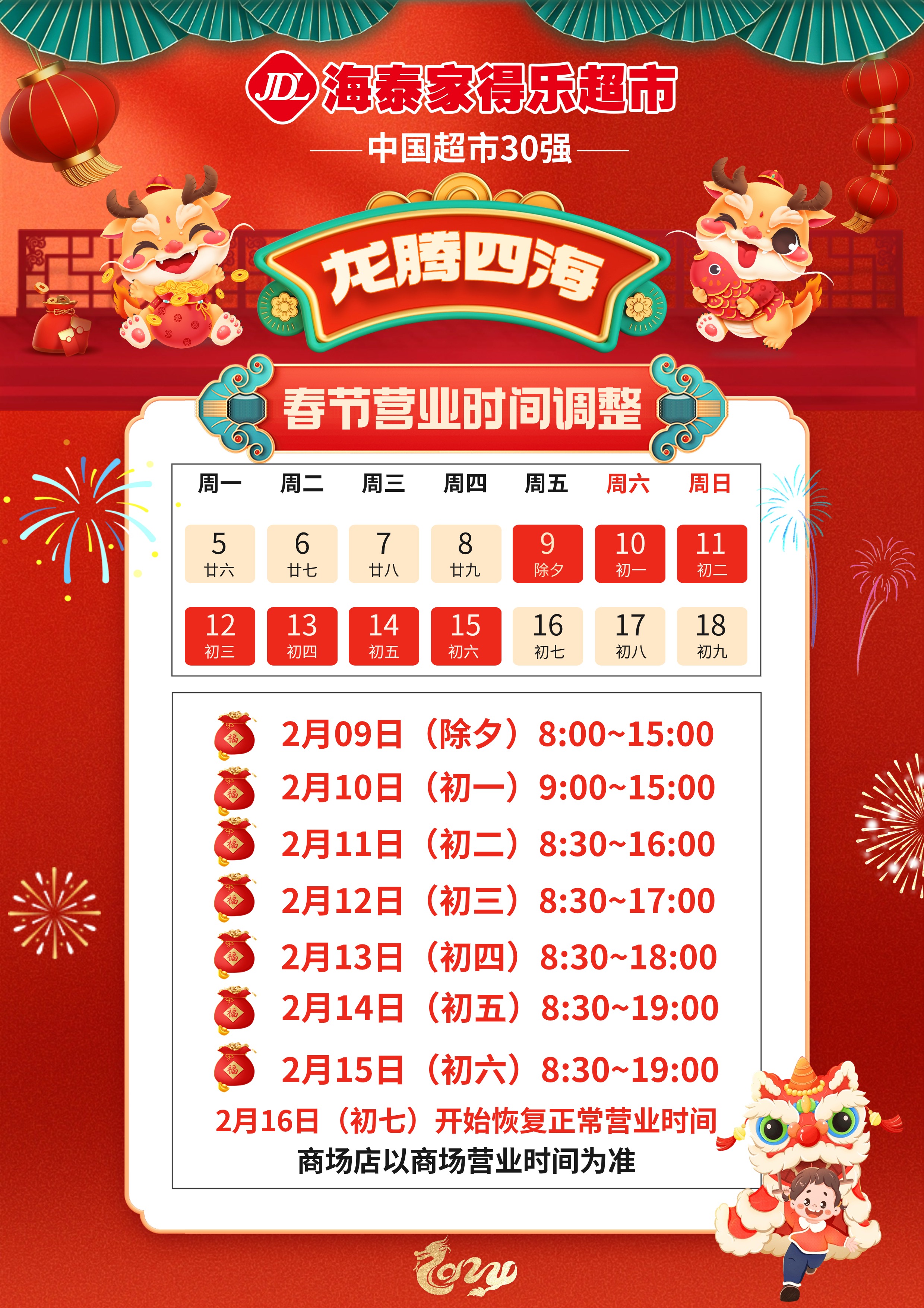 2024龙年大吉!春节期间营业时间调整通知!